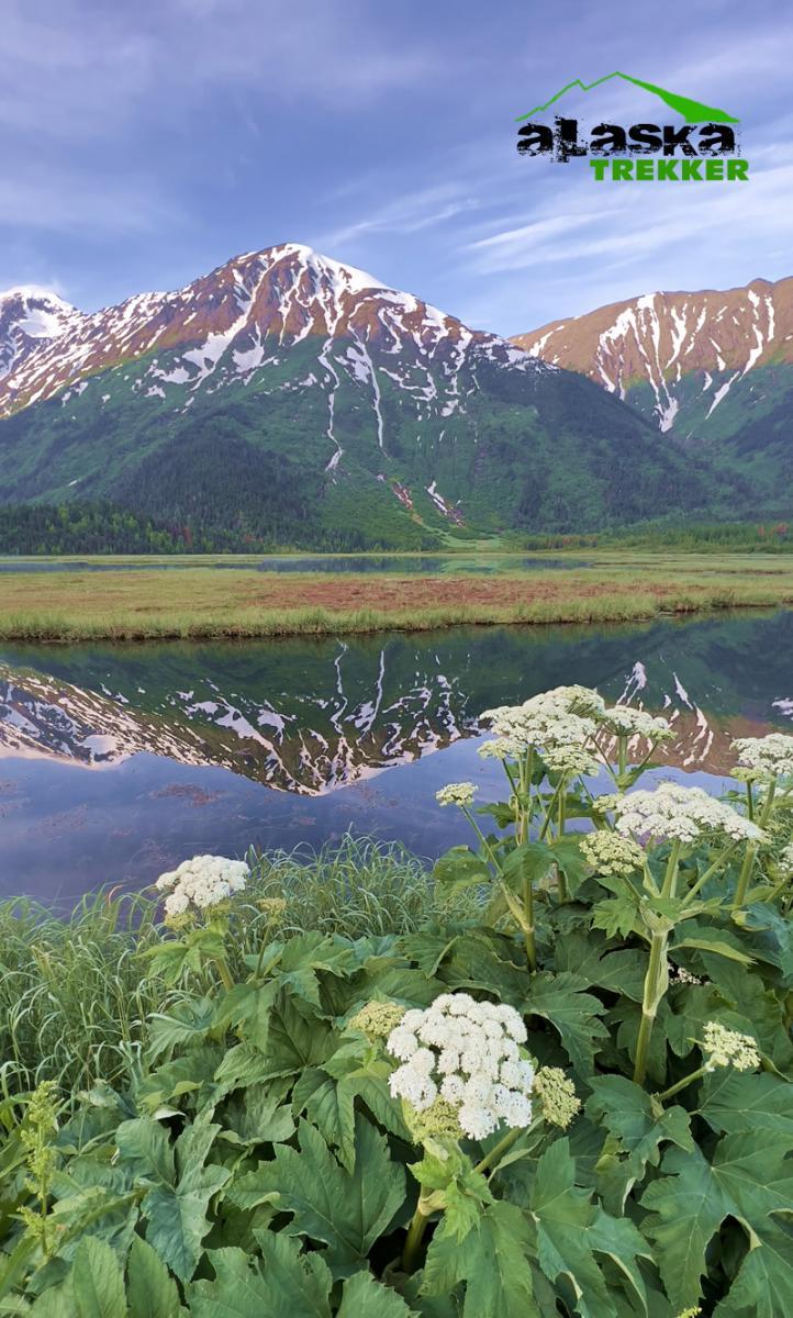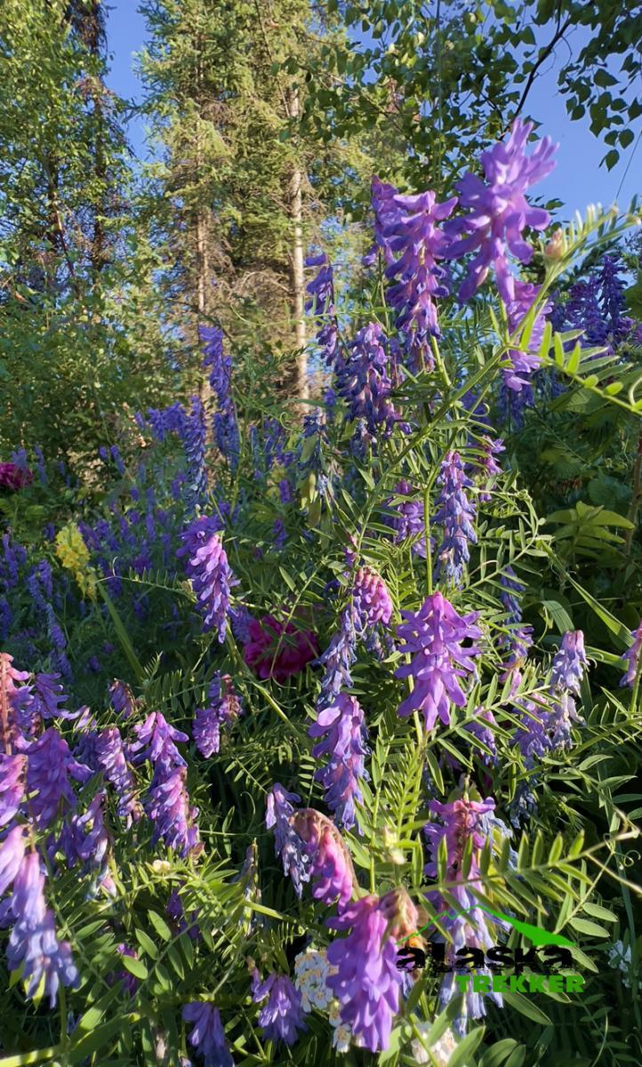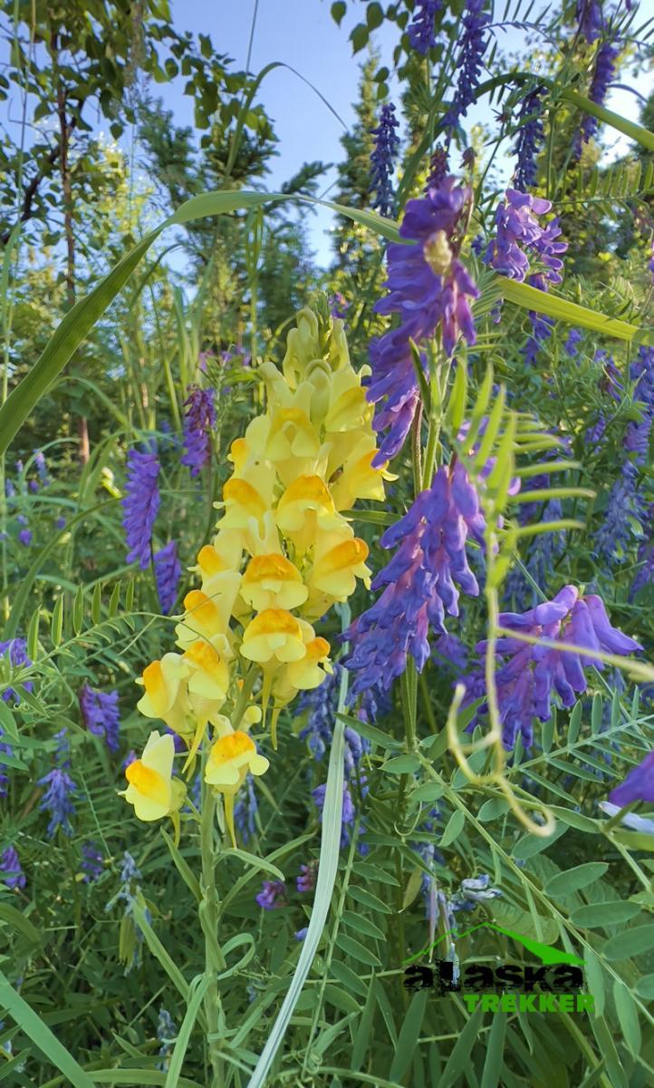 The Lupine lives in open habitats like gravel bars, meadows, marshes, and slopes. Like most members of this family, lupins can fix nitrogen from the atmosphere into ammonia, fertilizing the soil for other plants. Bears love to eat the roots. Some butterflies feed off the lupine and lay their eggs on its leaves. The flowers are produced in dense or open whorls on an erect spike, each flower 1-2 cm long, with a typical peaflower shape with an upper ‘standard’, two lateral ‘wings’ and two lower petals fused as a ‘keel’. The fruit is a pod containing several seeds.
