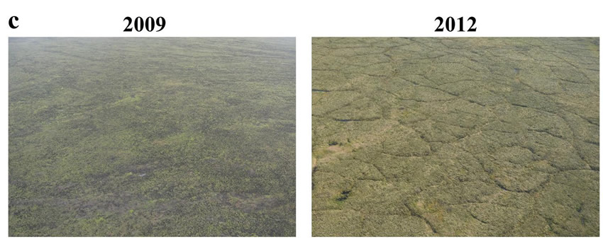 While northern Alaska’s treeless terrain has not seen a repeat of the largest tundra fire in modern times, researchers have kept their eyes on the Anaktuvuk River site. They watched green plants return in great number. Zooming out a bit, they watched the smooth face of the landscape is become pocked with thaw-pits.