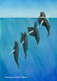 The humpback has the most diverse feeding repertoire of all baleen whales.Its most inventive technique is known as bubble net feeding; a group of whales swims in a shrinking circle blowing bubbles below a school of prey. The shrinking ring of bubbles encircles the school and confines it in an ever-smaller cylinder. This ring can begin at up to 98 ft in diameter and involve the cooperation of a dozen animals. Using a crittercam attached to a whale’s back, researchers found that some whales blow the bubbles, some dive deeper to drive fish toward the surface, and others herd prey into the net by vocalizing. The whales then suddenly swim upward through the “net”, mouths agape, swallowing thousands of fish in one gulp. Plated grooves in the whale’s mouth allow the creature to easily drain all the water initially taken in.