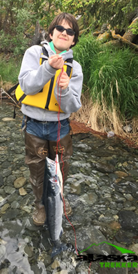 Silver salmon have silver sides and dark-blue backs and put up a great fight with lots of jumping. Alaskans look forward to “Silver Season” in August. Silver’s usually weigh 8 to 12 pounds and are 24 to 30 inches long, but individuals weighing 36 pounds have been landed. The best part about fishing for silvers at the confluence is that the place is usually empty and crawling with fat fish.